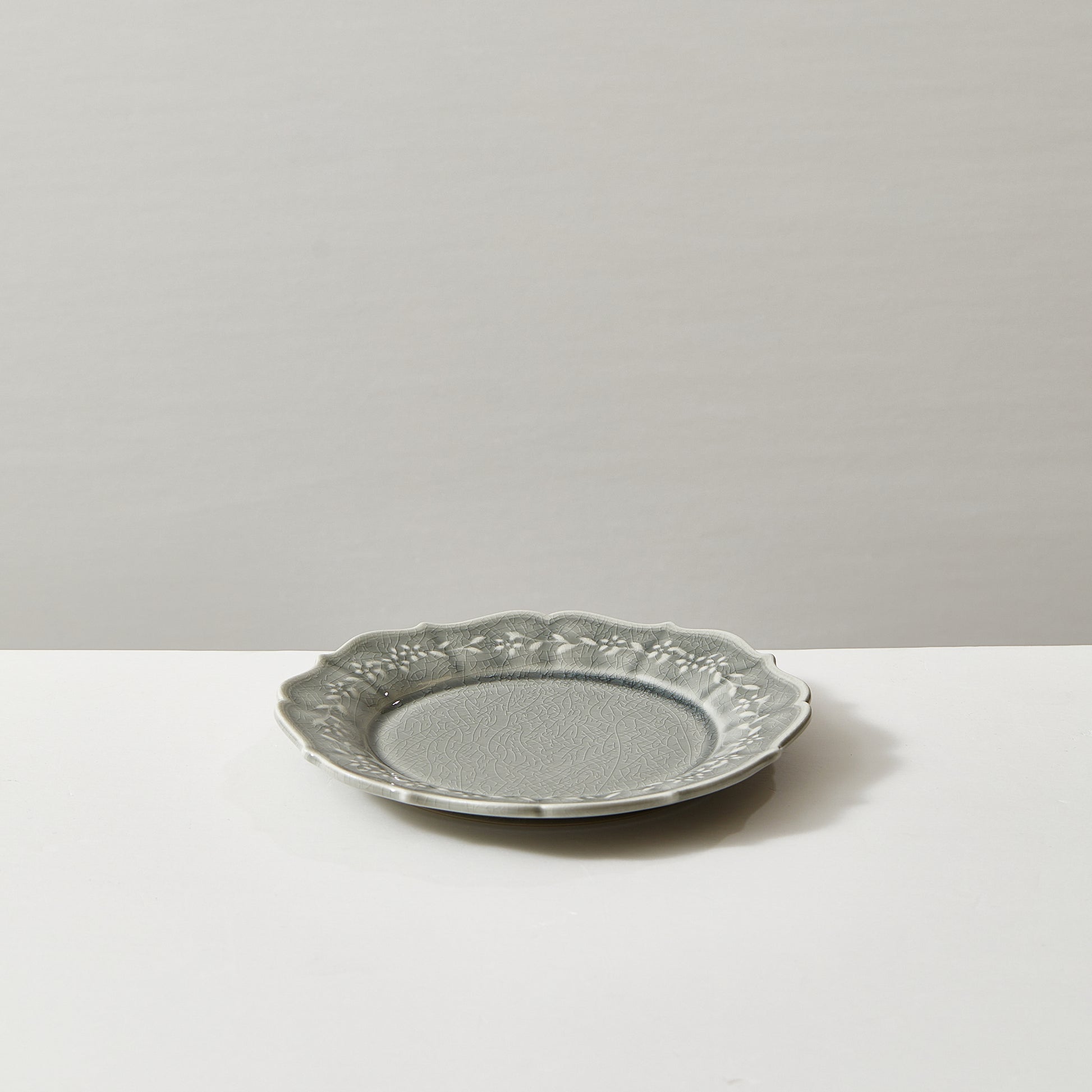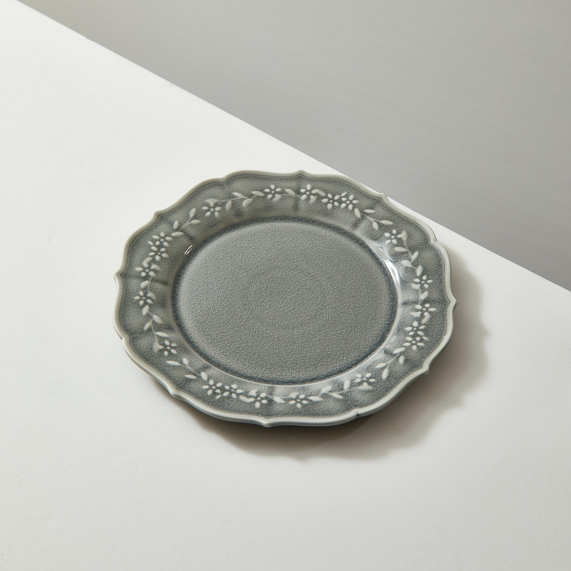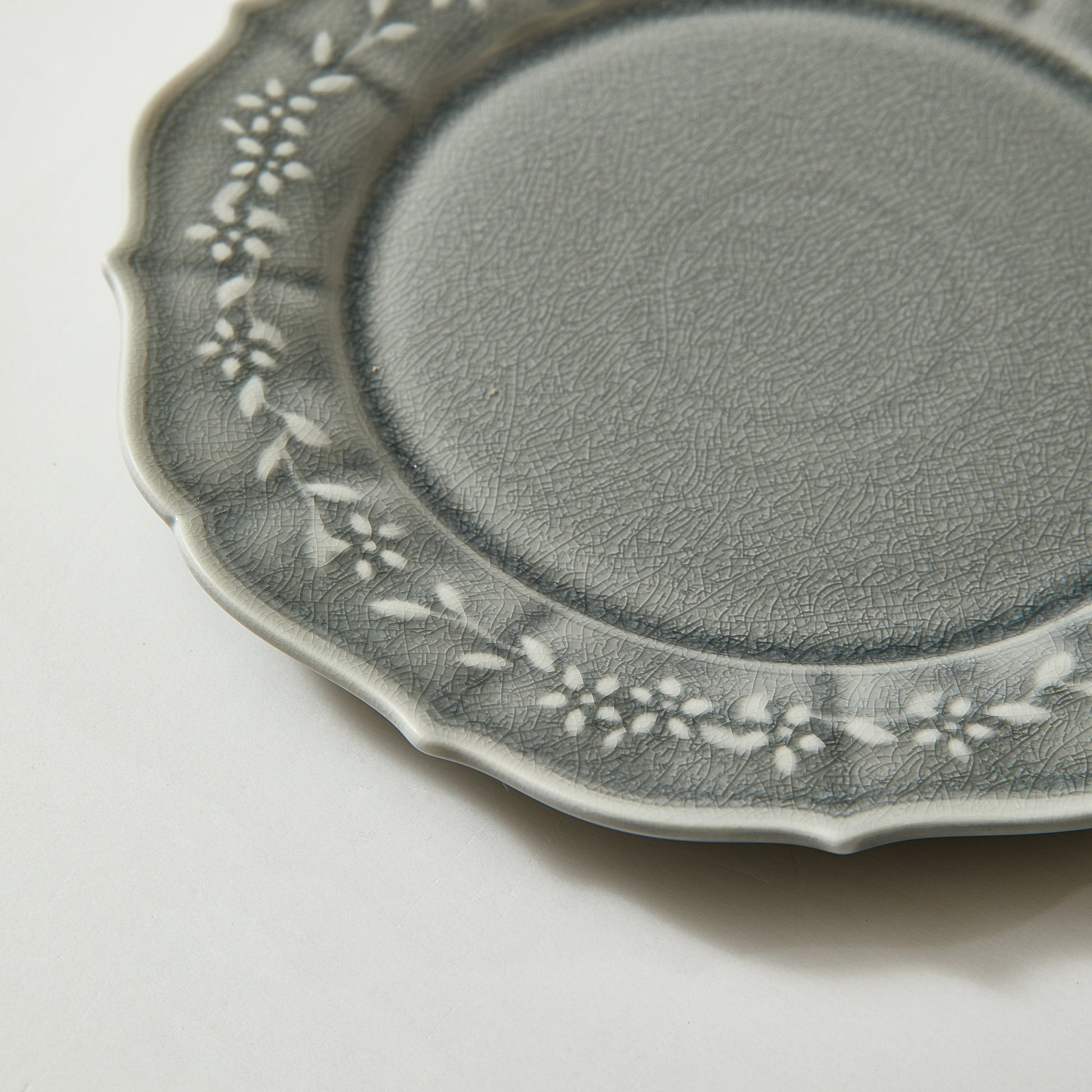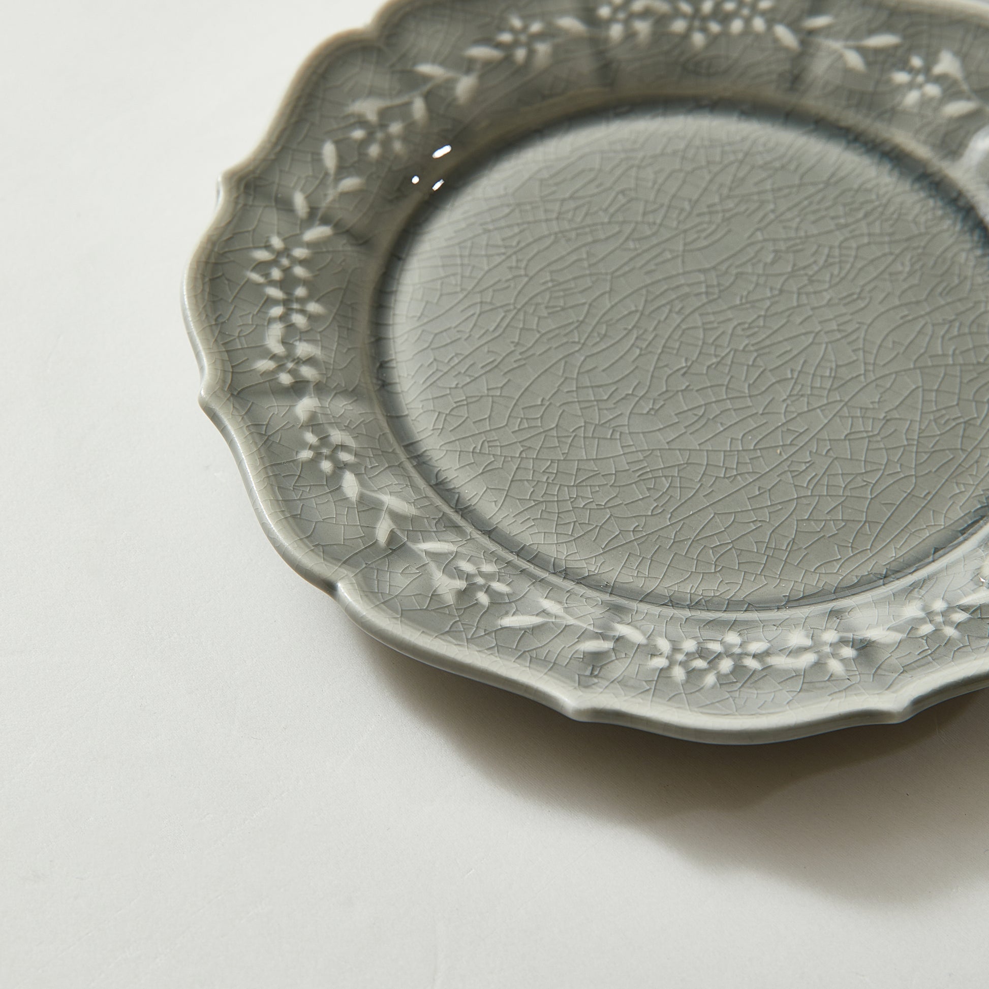 The Brigitte Dinner Plate was designed to blend delicacy with elegance. It features a distinctive Floral Embossed lace detailing along the edges and antique style crackle glaze. Perfect for serving dessert or dinner.